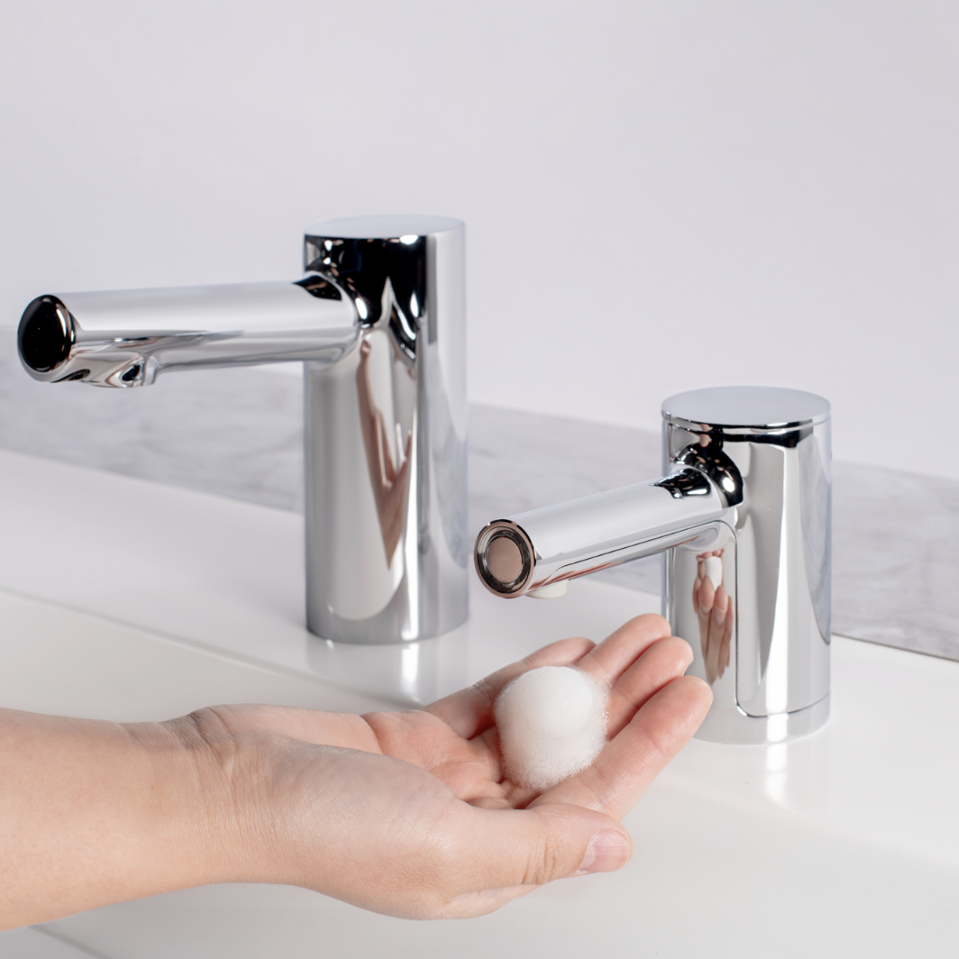Automatic Fino Collection foam soap dispenser in a contemporary cylindrical design made made with diecast zinc spout body. Touch-free dispenser minimizes cross-contamination for hygienic handwashing. Patented top-fill design reduces maintenance time and cost with easy above-counter filling. Dispenses economical bulk jug soap for significant cost-in-use savings and waste reduction. Low Soap Level Indicator informs maintenance when to refill. Adjustable soap control dial addresses patron preferences. New look pairs beautifully with matching Bobrick Fino Collection faucet and is available in five finishes for design continuity: polished chrome, brushed nickel, matte black, brushed brass and polished graphite.