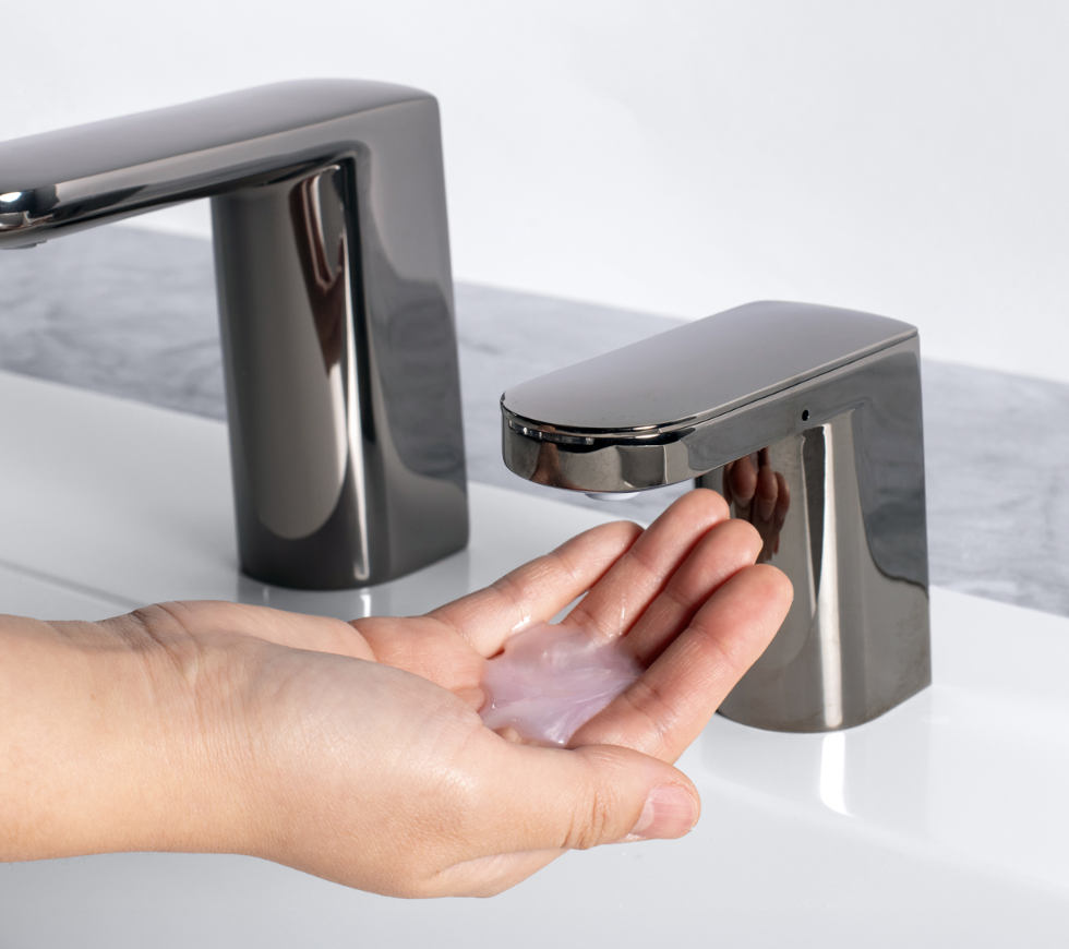 Automatic Fino Collection liquid soap dispenser in a streamlined, modern design made with diecast zinc spout body. Touch-free dispenser minimizes cross-contamination for hygienic handwashing. Patented top-fill design reduces maintenance time and cost with easy above-counter filling. Dispenses economical bulk jug soap for significant cost-in-use savings and waste reduction. Low Soap Level Indicator informs maintenance when to refill. Adjustable soap control dial addresses patron preferences. New look pairs beautifully with matching Bobrick Fino Collection faucet and is available in five finishes for design continuity: polished chrome, brushed nickel, matte black, brushed brass and polished graphite.