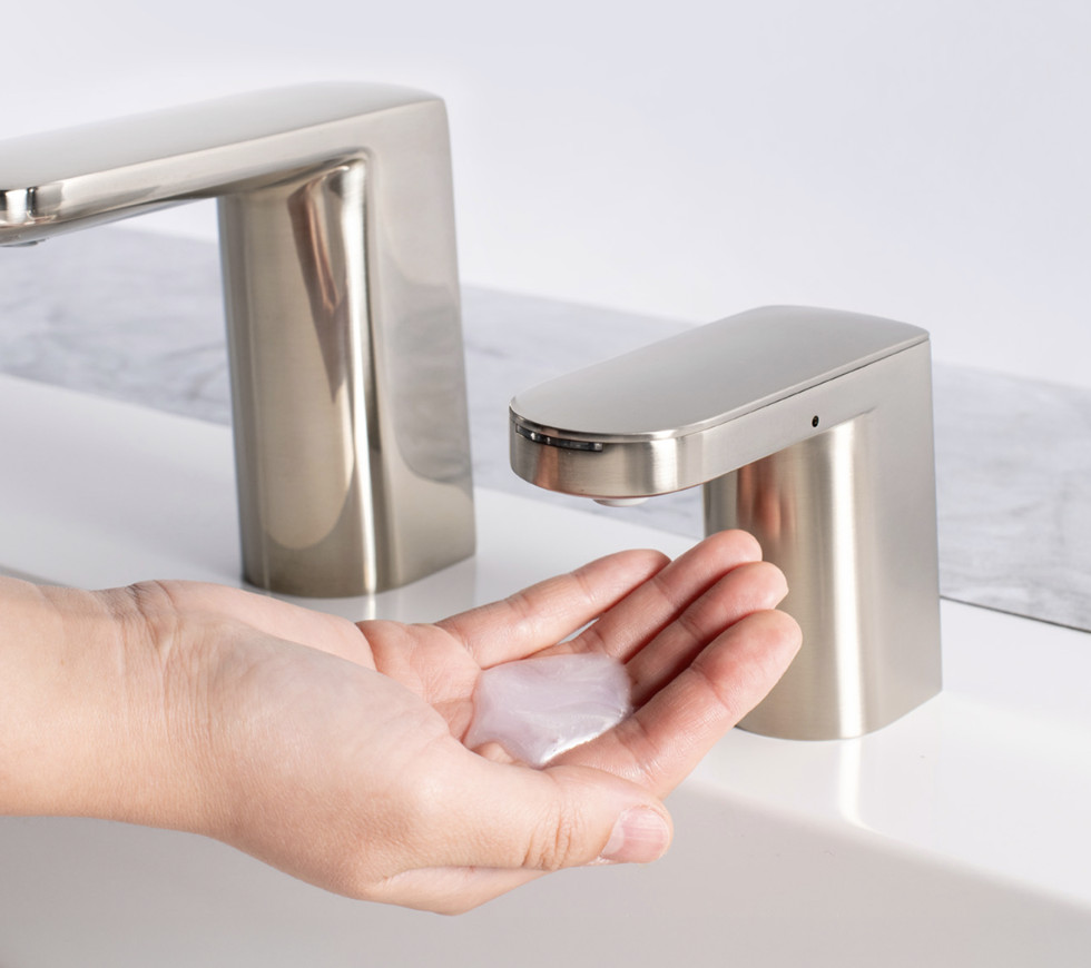 Automatic Fino Collection liquid soap dispenser in a streamlined, modern design made with diecast zinc spout body. Touch-free dispenser minimizes cross-contamination for hygienic handwashing. Patented top-fill design reduces maintenance time and cost with easy above-counter filling. Dispenses economical bulk jug soap for significant cost-in-use savings and waste reduction. Low Soap Level Indicator informs maintenance when to refill. Adjustable soap control dial addresses patron preferences. New look pairs beautifully with matching Bobrick Fino Collection faucet and is available in five finishes for design continuity: polished chrome, brushed nickel, matte black, brushed brass and polished graphite.
