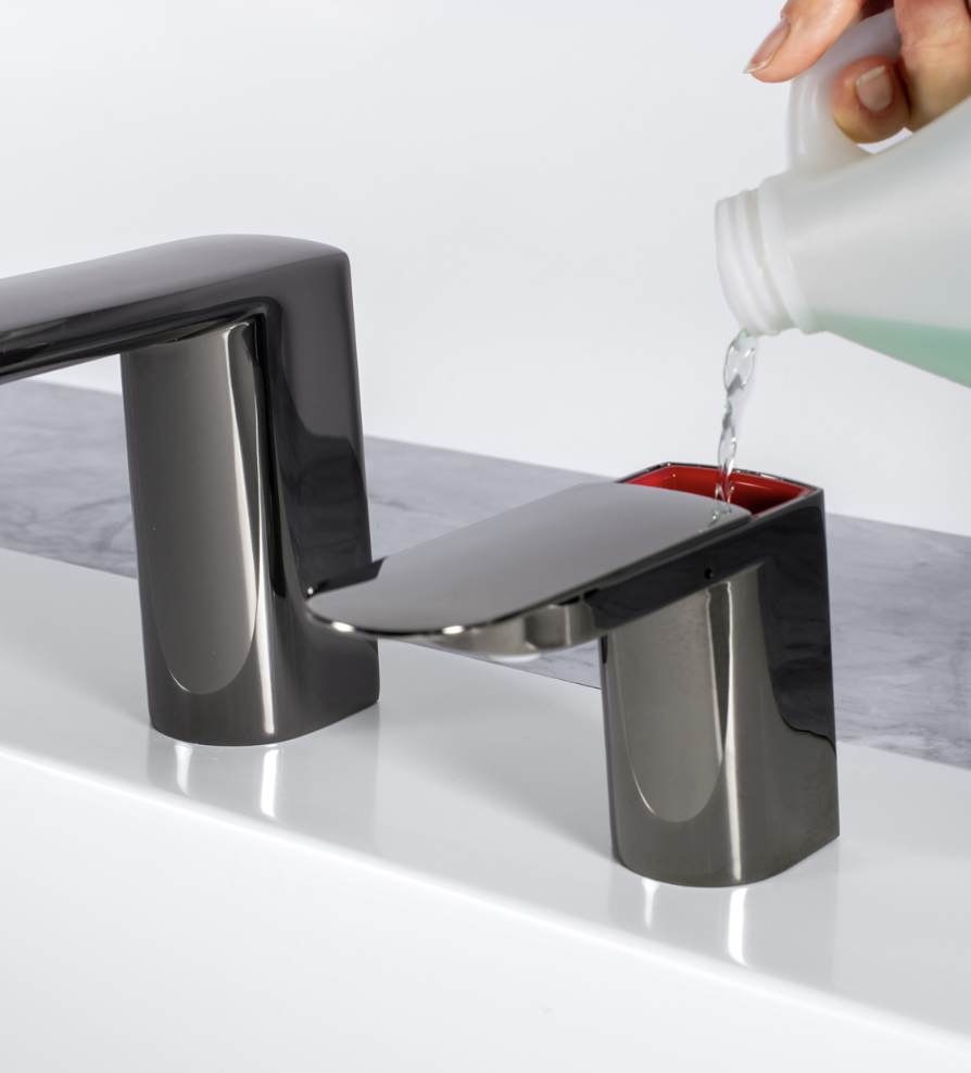 Automatic Fino Collection foam soap dispenser in a streamlined, modern design made with diecast zinc spout body. Touch-free dispenser minimizes cross-contamination for hygienic handwashing. Patented top-fill design reduces maintenance time and cost with easy above-counter filling. Dispenses economical bulk jug soap for significant cost-in-use savings and waste reduction. Low Soap Level Indicator informs maintenance when to refill. Adjustable soap control dial addresses patron preferences. New look pairs beautifully with matching Bobrick Fino Collection faucet and is available in five finishes for design continuity: polished chrome, brushed nickel, matte black, brushed brass and polished graphite.