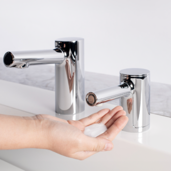 Automatic Fino Collection liquid soap dispenser in a contemporary cylindrical design made with diecast zinc spout body. Touch-free dispenser minimizes cross-contamination for hygienic handwashing. Patented top-fill design reduces maintenance time and cost with easy above-counter filling. Dispenses economical bulk jug soap for significant cost-in-use savings and waste reduction. Low Soap Level Indicator informs maintenance when to refill. Adjustable soap control dial addresses patron preferences. New look pairs beautifully with matching Bobrick Fino Collection faucet and is available in five finishes for design continuity: polished chrome, brushed nickel, matte black, brushed brass and polished graphite.